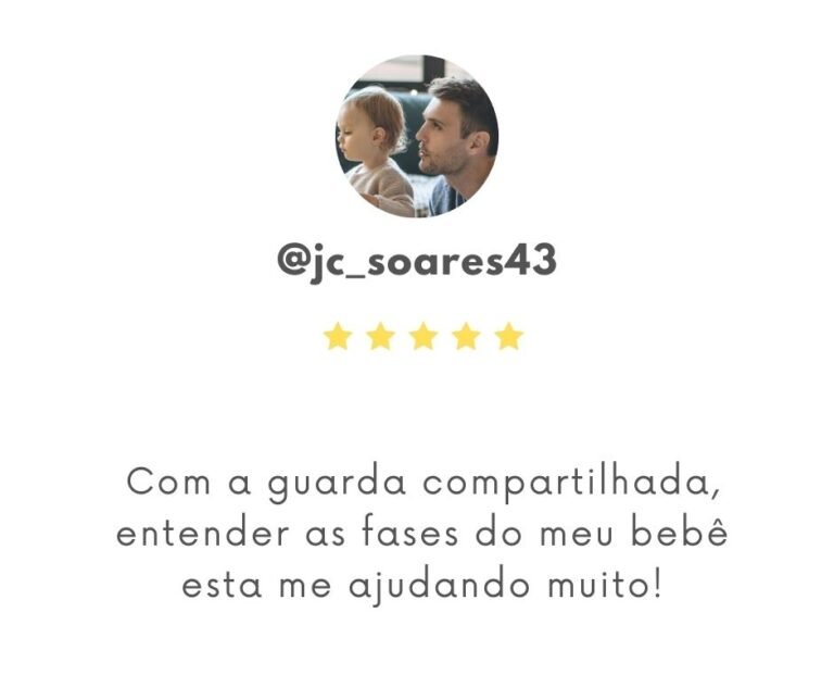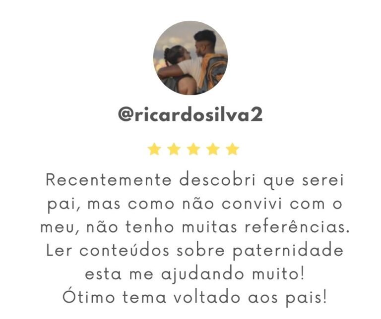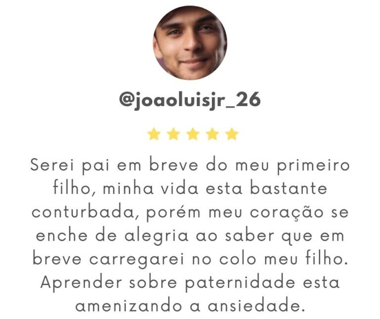Guia Paternidade do 0 aos 7 anos + Guia grátis Tipos de Choro e como Reconhecê-los + Guia grátis de Enxoval para o Bebê + Guia Aplicativos Essenciais para cuidar do bebê . Se por algum motivo você não ficar completamente satisfeito (a) com todo o conteúdo, entre em contato conosco dentro de 7 dias para receber o reembolso total do seu investimento.